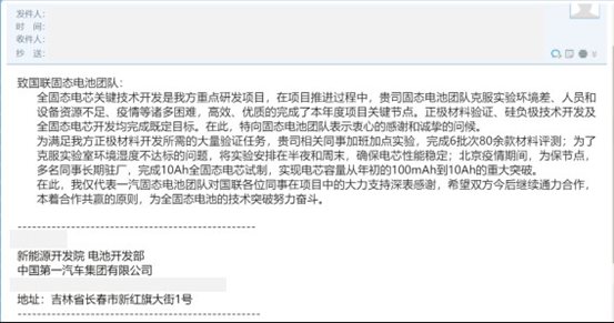 12月8日,國聯(lián)研究院固態(tài)電池團(tuán)隊(duì)收到股東單位中國第一汽車集團(tuán)有限公司新能源開發(fā)院電池研究所發(fā)來的感謝信。