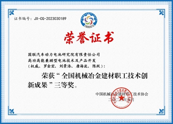 近日,由中國機(jī)械冶金建材職工技術(shù)協(xié)會(huì)主辦的“2023年全國機(jī)械冶金建材行業(yè)職工技術(shù)創(chuàng)新成果”評(píng)選結(jié)果揭曉,國聯(lián)研究院推薦申報(bào)項(xiàng)目《高功高能兼顧型電池技術(shù)及產(chǎn)品開發(fā)》榮獲三等獎(jiǎng)。